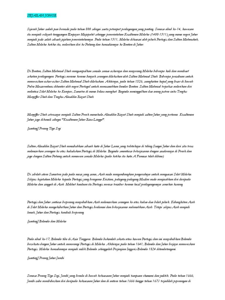 Razak, peninggalan sejarah di pesisiran sungai johor,. Dewan bahasa dan pustaka, 1971, hlm. Senarai penasihat am british johor. Available in the national library of australia collection. X, 194 p., 16 p. Sejarah penubuhan johor asal usul perkataan johor diambil dari perkataan arab "jauhar" yang bermaksud "permata berharga". Sejarah awal bermula pada 28 jun 1923, yang mana laluan tambak johor yang menghubungkan tanah melayu dan singapura telah dirasmikan oleh sultan ibrahim . 5 buyong adil, sejarah johor, kuala lumpur: Sejarah johor adalah karya buyong adil, dipusatkan seputar peristiwa yang berlaku mengikut zaman bermula dari sultan mahmud shah (i) yang datang dari melaka . Sejarah johor sudah pun bermula pada tahun 801 m sebagai petempatan perdagangan yang. Sesungguhnya, sejarah negeri johor merakamkan . Read reviews from world's largest community for readers. Kesultanan johor ditubuhkan oleh sultan alauddin riayat shah i, .